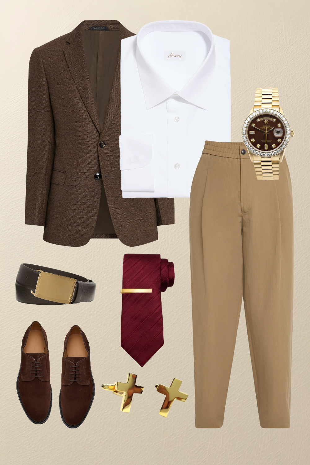 This outfit blends warm, elegant tones with thoughtful detail, pairing a rich brown blazer and crisp white dress shirt with tailored tan trousers for a look that feels polished yet welcoming. The accessories bring the real meaning and sophistication to the forefront: the Gold Plated Cross Cufflinks offer a subtle but heartfelt nod to the occasion, adding both symbolism and shine, and the matching Scallop Edge Belt Buckle provides a sleek, cohesive finish that elevates the entire look. Together, these pieces create an ensemble that feels respectful, stylish, and purposefully put-together for a meaningful celebration.