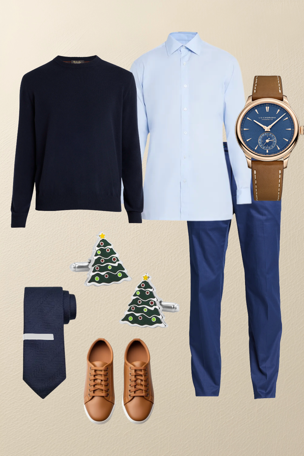 Elevate your festive look with these standout accessories. Our Christmas Tree Cufflinks add a touch of playful elegance to your crisp dress shirt, while the matching Silver Tie Bar keeps your tie perfectly in place and adds a subtle gleam. Pair them with a tailored suit in classic navy or charcoal, and finish with polished leather shoes for a look that’s both sophisticated and seasonally spirited. Perfect for holiday parties, office gatherings, or any occasion where you want to celebrate in style.