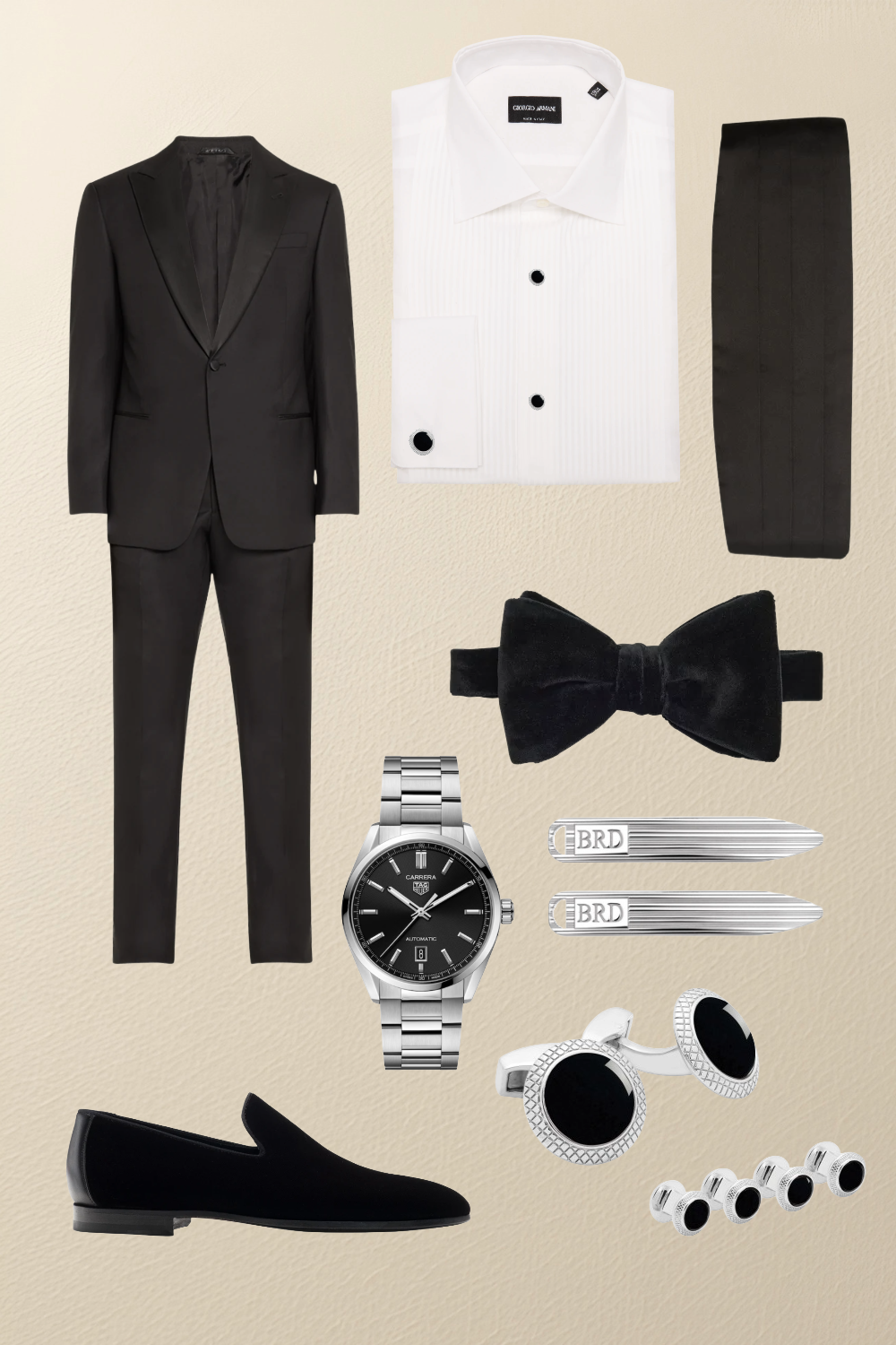 This New Year’s Eve ensemble is the definition of refined elegance, built on the timeless foundation of a crisp tuxedo. The look is elevated by a distinguished Onyx Bullseye Stud Set, which adds a sharp, polished contrast against the white shirt and ties the entire palette together with quiet sophistication. Equally luxurious are the Custom White Gold Collar Stays—an understated detail known only to the wearer, yet one that ensures the collar maintains a flawless shape while adding a touch of personal opulence. This outfit achieves a perfect balance of tradition, modernity, and subtle indulgence—ideal for welcoming the new year in impeccable style.