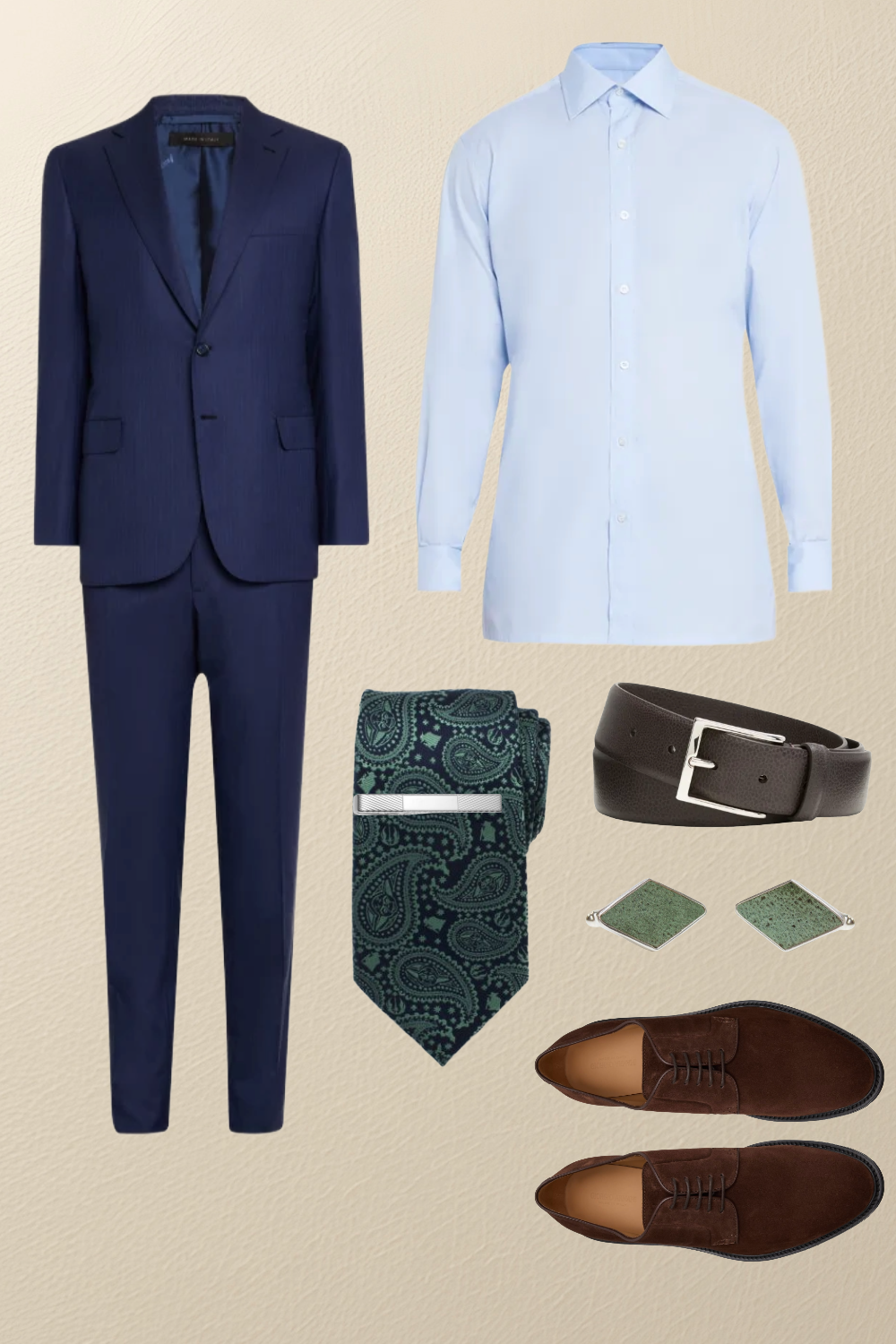 This holiday brunch outfit brings together relaxed sophistication and thoughtful personality. The real charm comes from the accessories: the Yoda Green Paisley Men's Tie adds a playful, unexpected touch that feels festive without being loud, and the cufflinks—crafted from materials sourced from the Greycliff Estate designed by Frank Lloyd Wright—introduce a unique architectural elegance. Together, these details infuse the ensemble with both character and heritage, making it perfect for a holiday gathering that blends comfort, style, and a hint of fun.