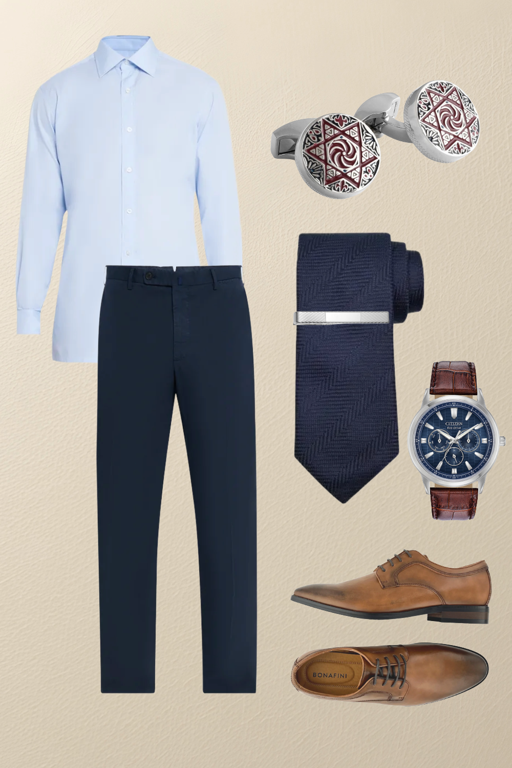 This Hanukkah look strikes the perfect balance between polished and festive. The soft blue dress shirt and deep navy trousers create a clean, refined foundation, while the textured navy tie and sleek tie bar add a touch of modern sophistication. But the true standout is the pair of ornate cufflinks. Their intricate geometric Star of David pattern and elegant mix of silver and deep red bring a subtle yet meaningful nod to tradition, adding just the right amount of celebratory flair.
